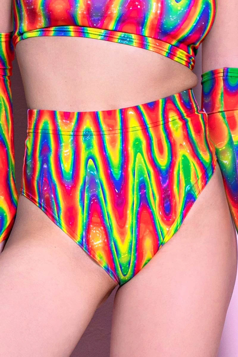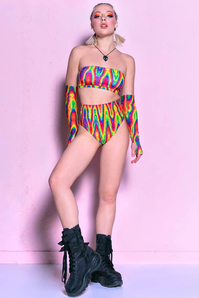 Up and down, and back and forth – our rippling rainbow set is made to make you proud all the way around! It includes three matching printed pieces – a strapless boob tube, a pair of rave booty shorts with a high waist, and a couple of fancy sleeves with thumbholes. Ready to capture their souls?