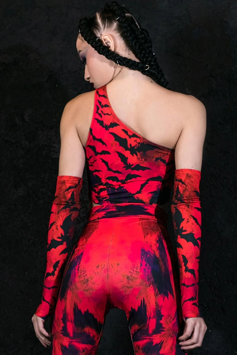 Stay ill-omened in this cheekily sinister crop top, printed with flying bats on a bloody pink base! It has an asymmetric one-shoulder design, a supportive friction fit, and a couple of matching sleeves u can add to the devilish style. They’ll be shocked to find out what’s behind the smile!